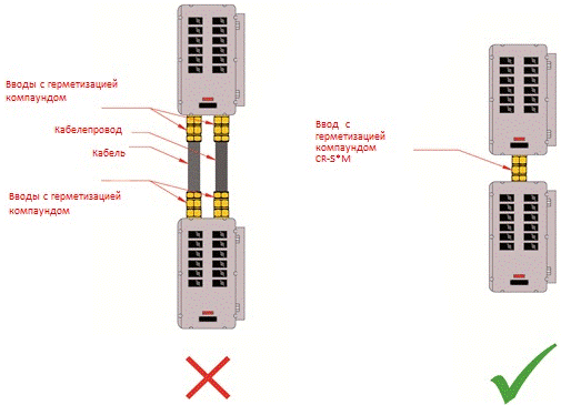 В случае возгорания или взрыва внутри одной оболочки это соединение предотвращает взрыв в другой. Данное решение обеспечивает целостность оборудования, но увеличивает стоимость и трудоемкость монтажа.